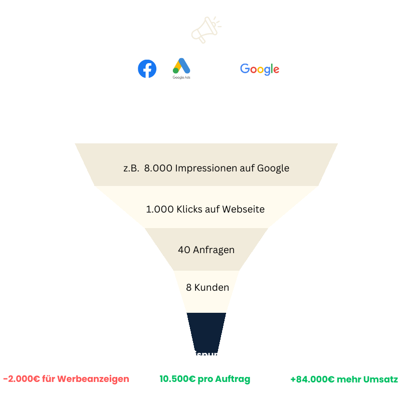 Du steigerst deinen Umsatz, während du den Aufwand reduzierst und steuerst flexibel die Anzahl deiner monatlichen Anfragen durch dein Werbebudget.